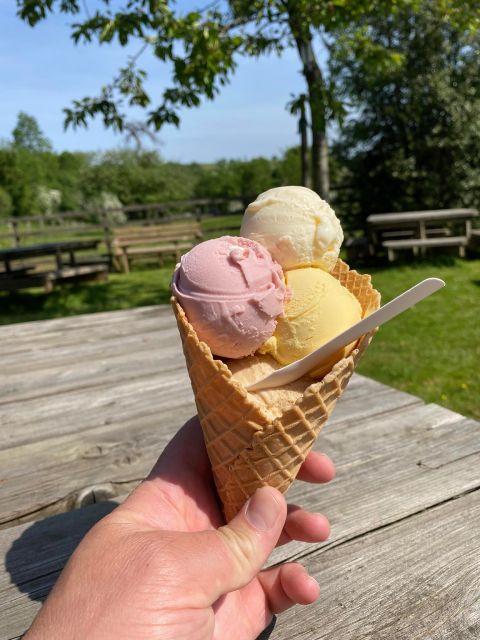 Le glacier Goé Glaces se trouve directement à la ferme, rue Robert Peutat. À la belle saison, une grande pelouse avec tables et parasols permet de savourer son cornet face aux prés où paissent les vaches. Les familles apprécient l’atmosphère simple et conviviale, les enfants profitent de l’espace extérieur pendant que les adultes prennent le temps de choisir leur parfum préféré.