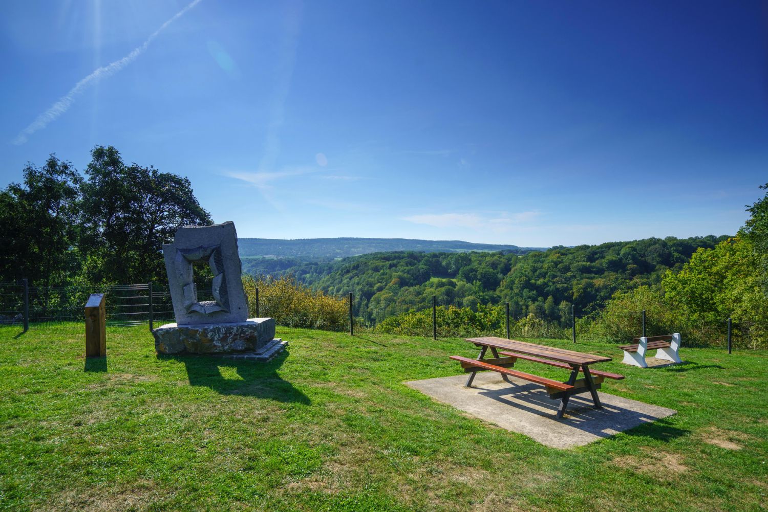 Wie iets lager afdaalt vanaf de stopplaats, krijgt zicht op de vallei van de Aisne, met haar zachte lijnen en het typische reliëf van de streek. De site is bewust sober ingericht, zonder overbodige elementen, zodat het rustige landschap volledig tot zijn recht komt. Op de plek staat ook “La Porte du Dedans”, een kunstwerk van Henri Hardy, geplaatst tijdens het Internationaal Beeldhouwsymposium van Durbuy, dat op een discrete manier in de omgeving opgaat.