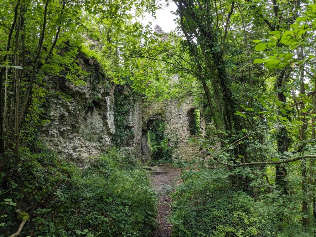 Uiteindelijk bereik u de top van de klif. Voor u liggen de Ruines du Château d'Amblève.